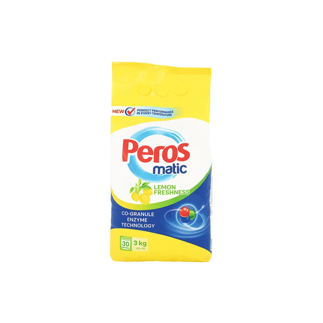Peros Matic me aromë limoni ofron pastërti të thellë dhe freski afatgjatë. Formula me enzima largon njollat vështirë dhe ruan ngjyrat e rrobave. Ideale për përdorim ditor dhe çdo temperaturë larjeje.