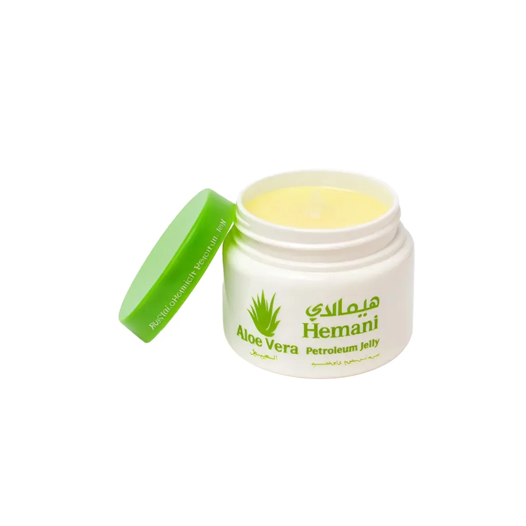 Vazelina Hemani me ekstrakt aloe vera hidraton thellë dhe qetëson lëkurën e thatë. Formula e butë e bën të përshtatshme për përdorim në duar, buzë dhe zona të irrituara. Ofron mbrojtje afatgjatë dhe shkëlqim natyral.