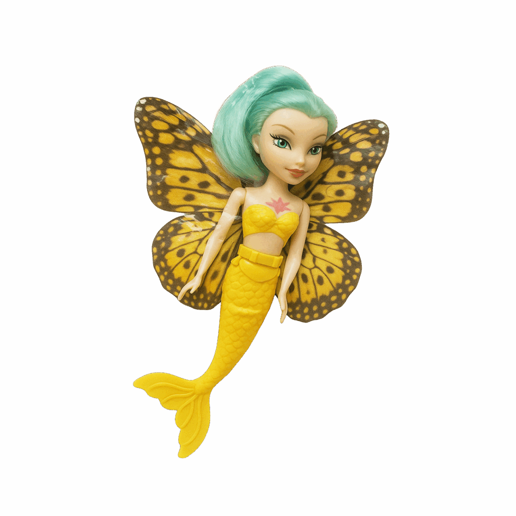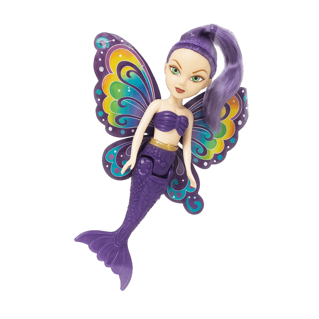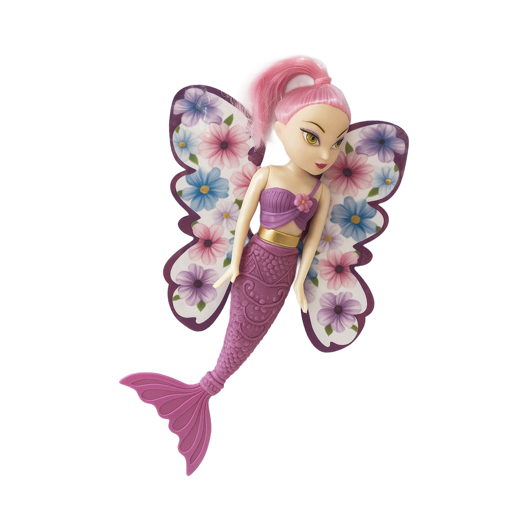 Kukull elegante sirenë me bisht dhe krahë fluture me motive lulesh në ngjyrë vjollcë. E punuar me detaje të bukura dhe materiale të sigurta për fëmijë, kjo lodër nxit imagjinatën dhe lojën kreative. Ideale si dhuratë për vajza që adhurojnë botën magjike të sirenave dhe zanave.