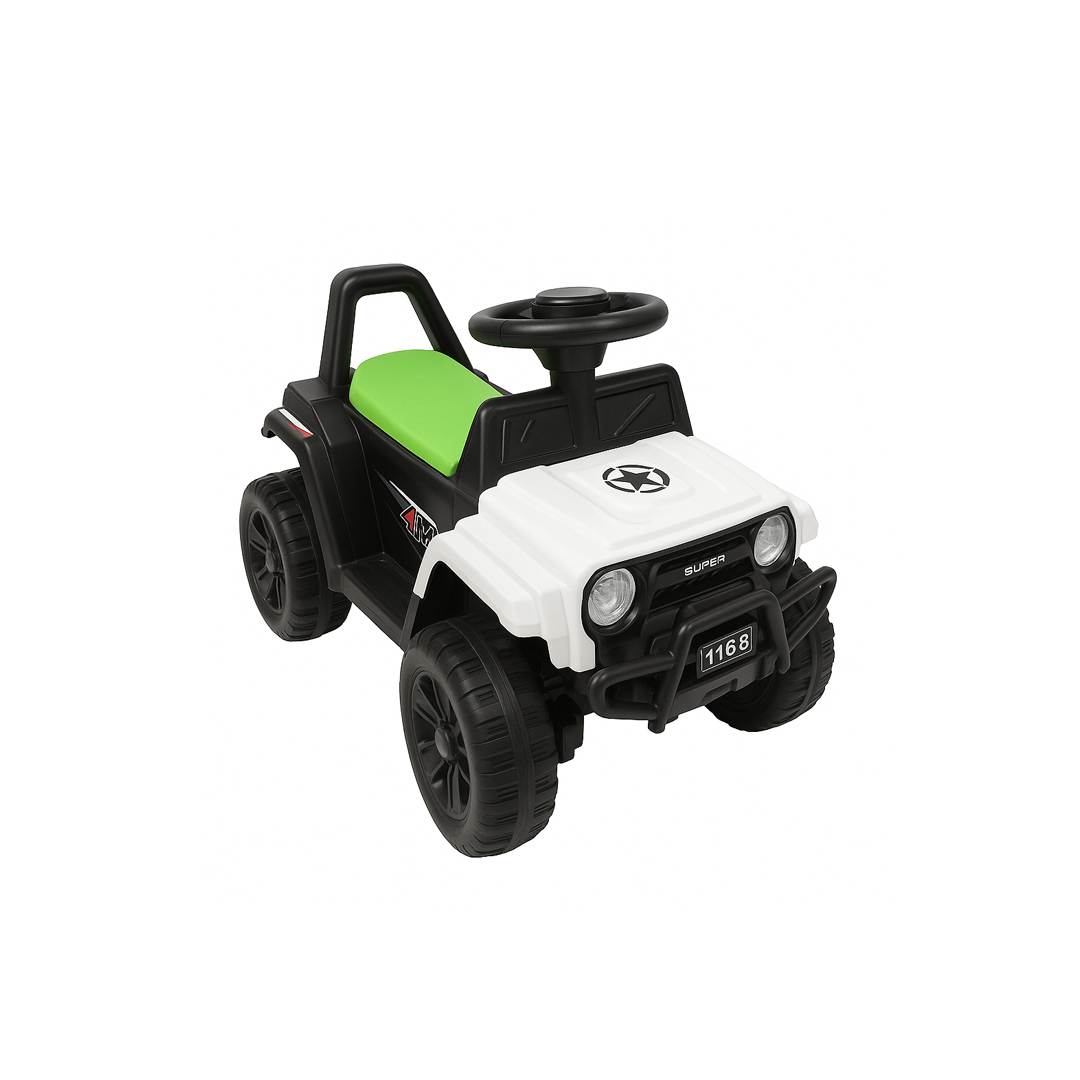Veturë plastike me timon funksional dhe dizajn realist. Ofron argëtim dhe zhvillon koordinimin motorik të fëmijëve. Strukturë e qëndrueshme dhe ulëse e rehatshme me ngjyrë jeshile.