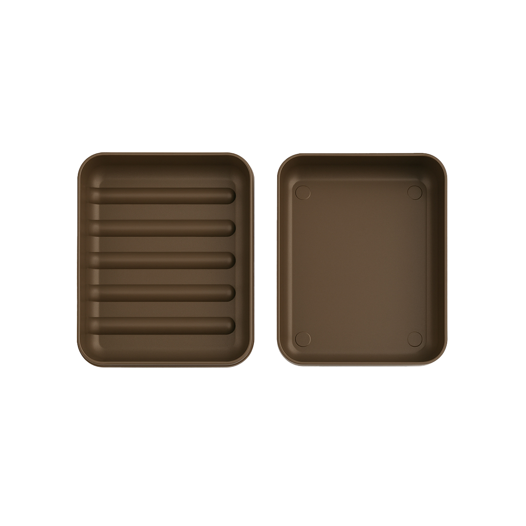 Mbajtëse funksionale plastike për sapun me dizajn praktik dhe të qëndrueshëm. Pjesa e poshtme lejon kullimin e ujit për të mbajtur sapunin të thatë dhe higjienik. Ngjyra kafe e errët i jep një pamje të ngrohtë dhe elegante banjos suaj.