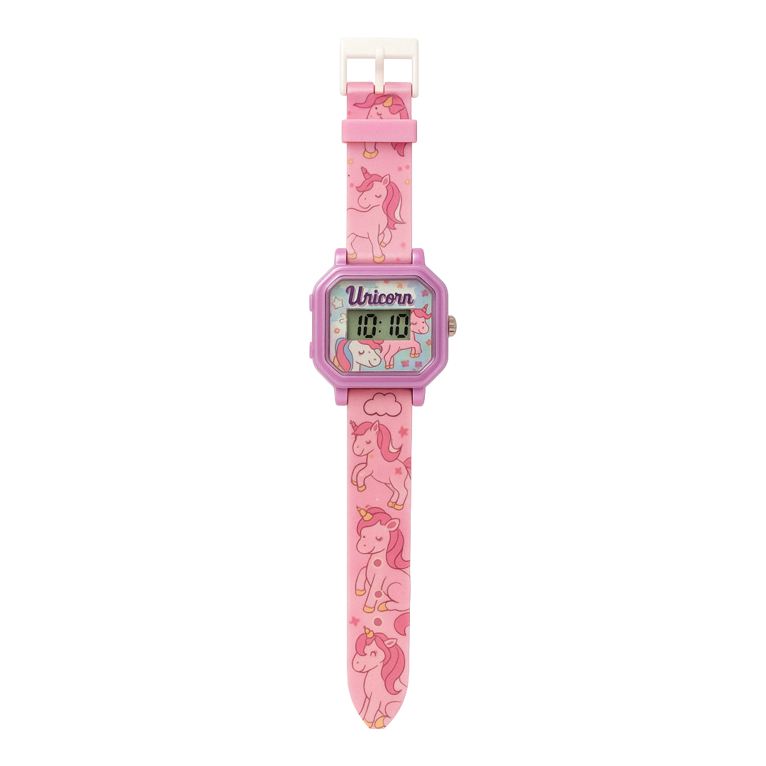 Orë digjitale me dizajn të lezetshëm njëbrirësh për vajza. Rrip i butë silikoni dhe ekran LCD për lexim të lehtë të orës. Aksesori ideal për përditshmëri dhe dhuratë për fëmijë.