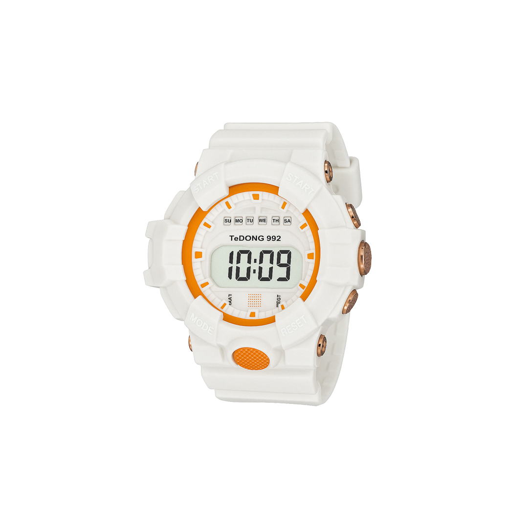 Orë digjitale me dizajn sportiv dhe detaje portokalli. Rezistente ndaj ujit, me funksione datë dhe ndriçim. Kombinon funksionalitetin me stilin për çdo aktivitet.
