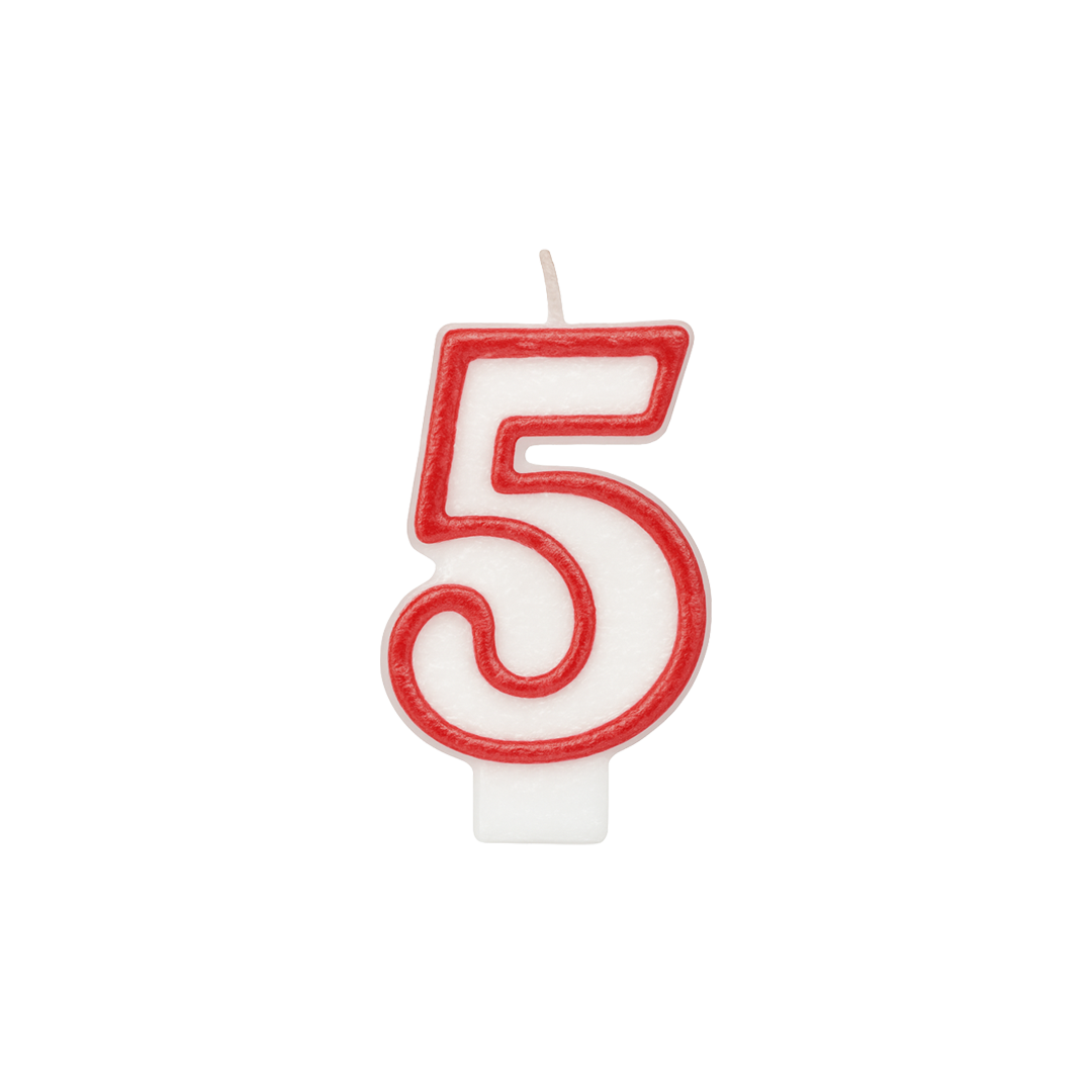 Qiri klasik në formë numri 5, me ngjyrë të bardhë dhe kontur të kuq për pamje festive. I përshtatshëm për torta ditëlindjesh, përvjetorë apo festa familjare. Kombinohet lehtë me qirinj të tjerë për të formuar çdo numër.