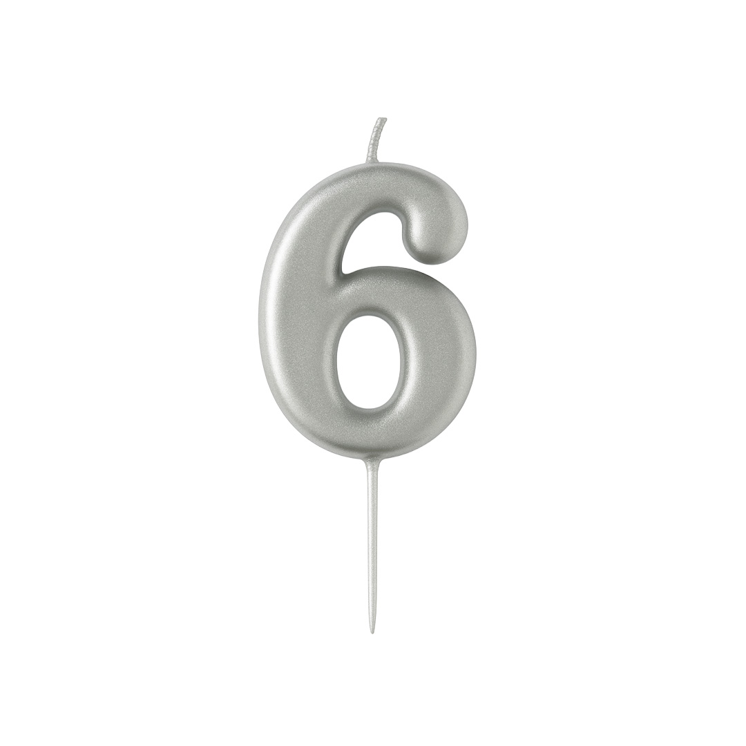 Qiri elegant në formë numri 6 me ngjyrë argjendi metalike. Ideale për torta ditëlindjesh, përvjetorë apo festa të veçanta. Jep shkëlqim dhe pamje festive çdo dekori.