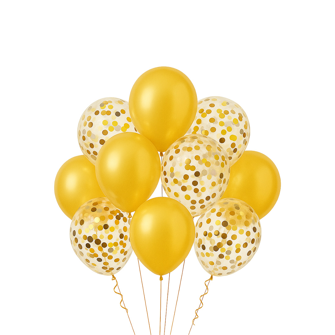Balona në ngjyrë të artë me kombinim konfetish për një pamje shkëlqyese. Të përshtatshme për festa, evente solemne dhe dekorime të veçanta.