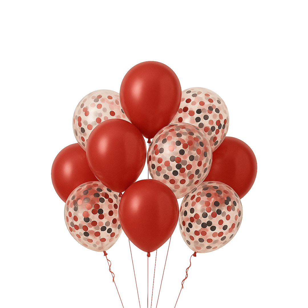 Balona në ngjyrë të kuqe me konfeti dekorative, perfekte për festa romantike, ditëlindje apo evente speciale. Krijojnë atmosferë të ngrohtë dhe festive.