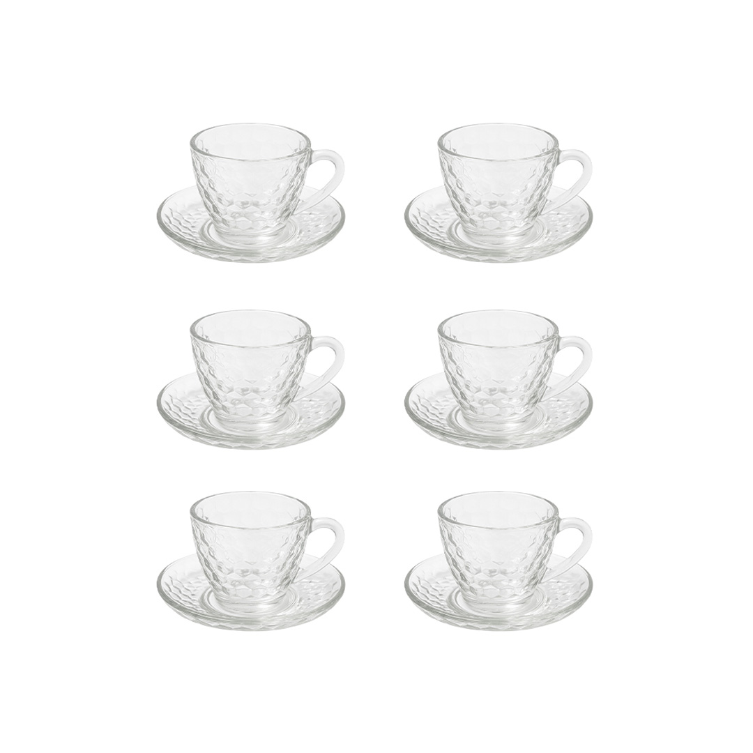 Set prej 6 filxhanësh qelqi elegant me pjatëza të dizajnuara në stil kristal. Ideale për servirjen e kafesë apo çajit me elegancë. Materiali i qëndrueshëm dhe transparent ofron ndriçim natyral dhe pastrim të lehtë pas çdo përdorimi.