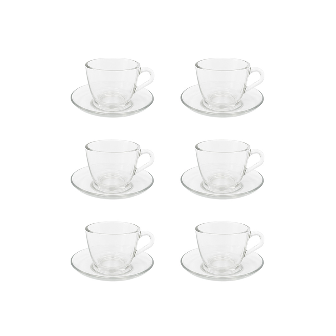 Set elegant prej qelqi transparent që përfshin 6 filxhanë me pjatëza të përshtatshme për kafe ose çaj. Dizajni i pastër dhe modern i bën idealë për përdorim të përditshëm ose për servirje elegante në tryezë. Rezistent ndaj temperaturave dhe i lehtë për pastrim.
