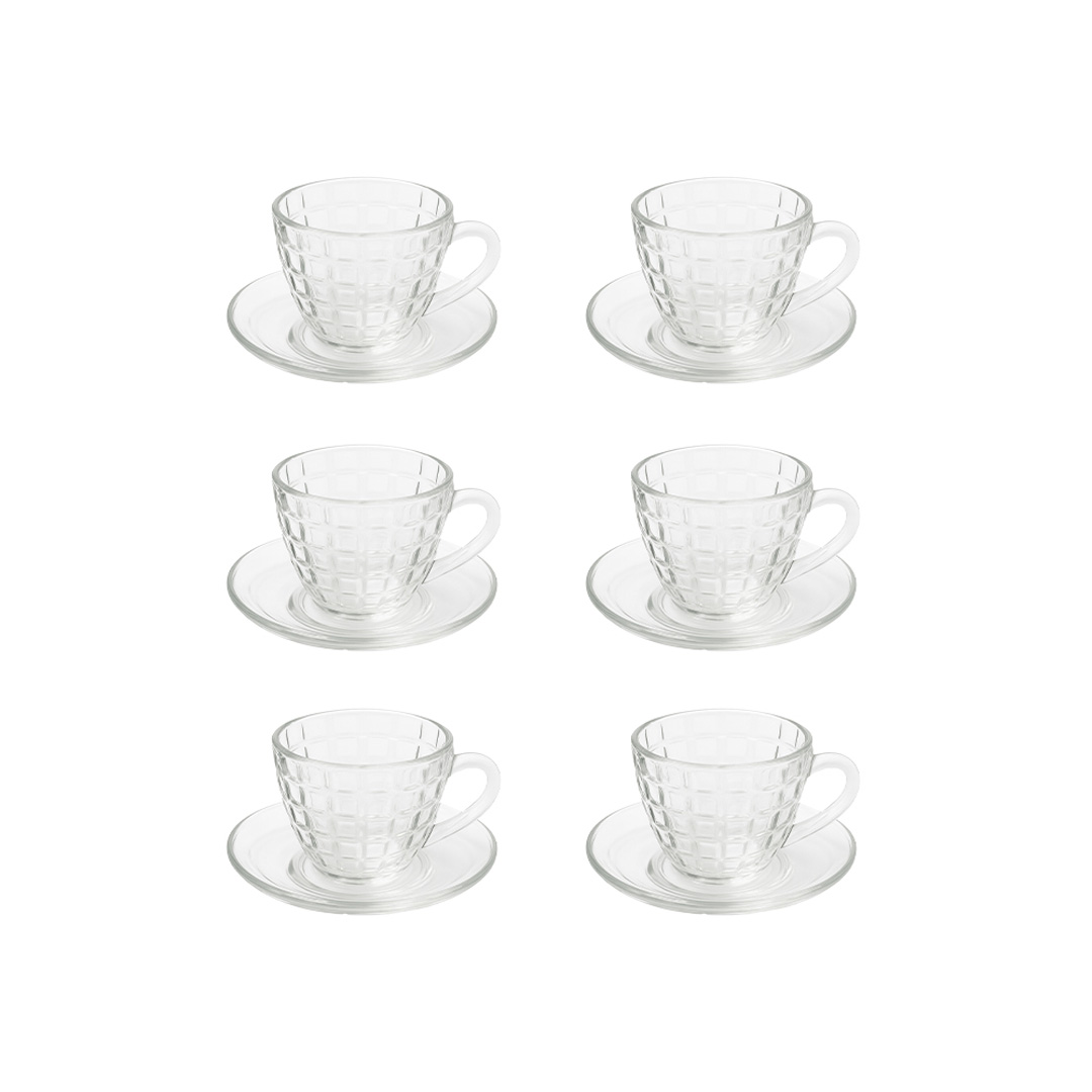 Set elegant me 6 filxhanë qelqi dhe pjatëza me model të gdhendur që sjellin hijeshi në çdo servirje. Ideale për kafe ose çaj, me dizajn transparent dhe ndërtim të qëndrueshëm ndaj nxehtësisë. Kombinon funksionalitetin me stilin për përdorim të përditshëm ose raste festive.