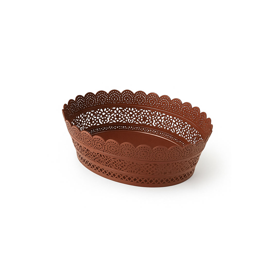 Shportë me stil elegant dhe formë ovale, e punuar me model dantelle për një pamje dekorative tërheqëse. Ideale për organizim të sendeve të vogla apo për zbukurim ambientesh. Ngjyra kafe i shton ngrohtësi dhe elegancë çdo hapësire.