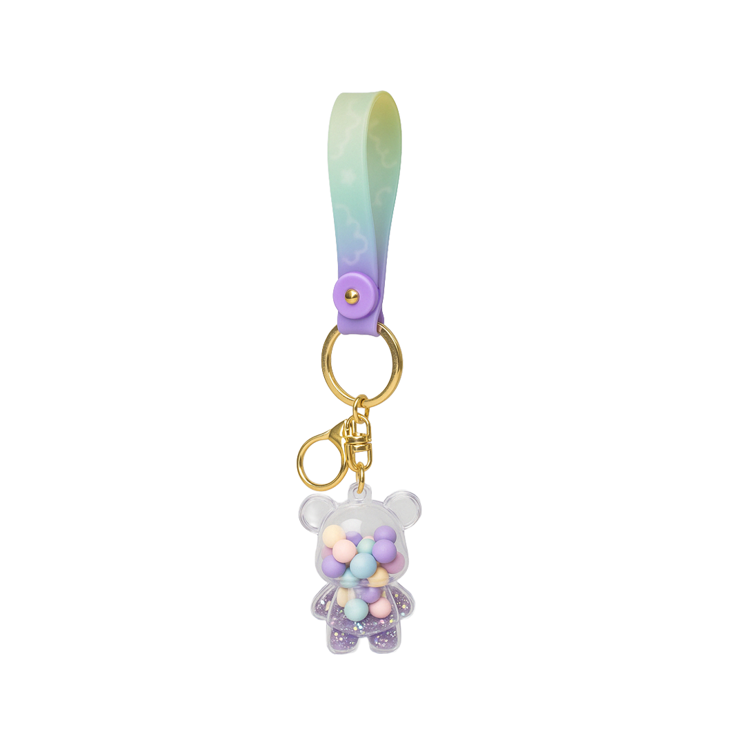 Varëse e ëmbël në formë ariu me toptha shumëngjyrëshe brenda. Kombinim i rripit pastel dhe metalit të artë për stil modern dhe argëtues. E përshtatshme për çelësa, çantë apo dhuratë.