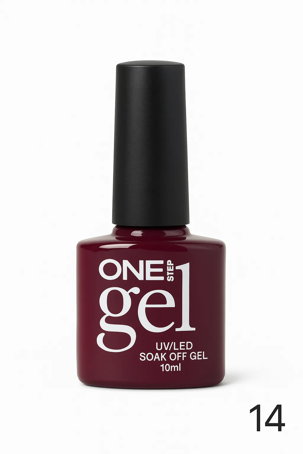 Xheli “One Step” me ngjyrë burgundy e errët nr. 14 ofron një pamje të rafinuar dhe elegante. Formula profesionale siguron mbulim të plotë, tharje të shpejtë dhe shkëlqim afatgjatë nën dritë UV/LED. Ideal për një manikyr klasik me stil të theksuar.